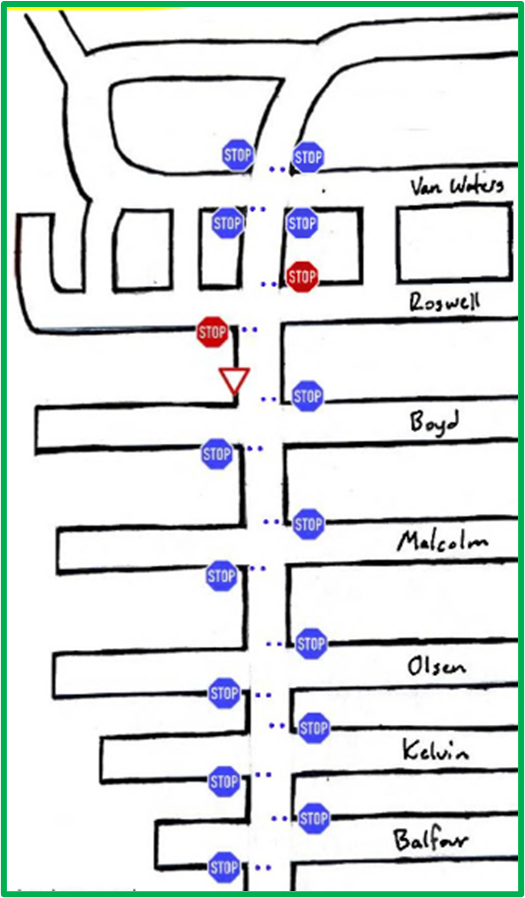 This diagram indicates the placement of the proposed stop signs (blue stop signs) and flexible delineators (dots):